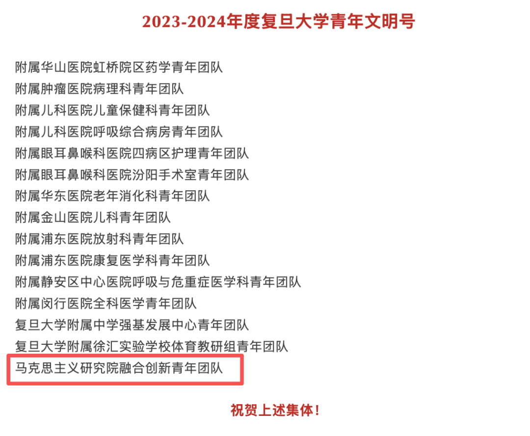 近日,复旦大学团委公布了2023-2024年度复旦大学青年文明号评选结果。马克思主义研究院融合创新青年团队经过创建申请、中期评审、终审答辩等环节,获得2023-2024年度复旦大学青年文明号命名。