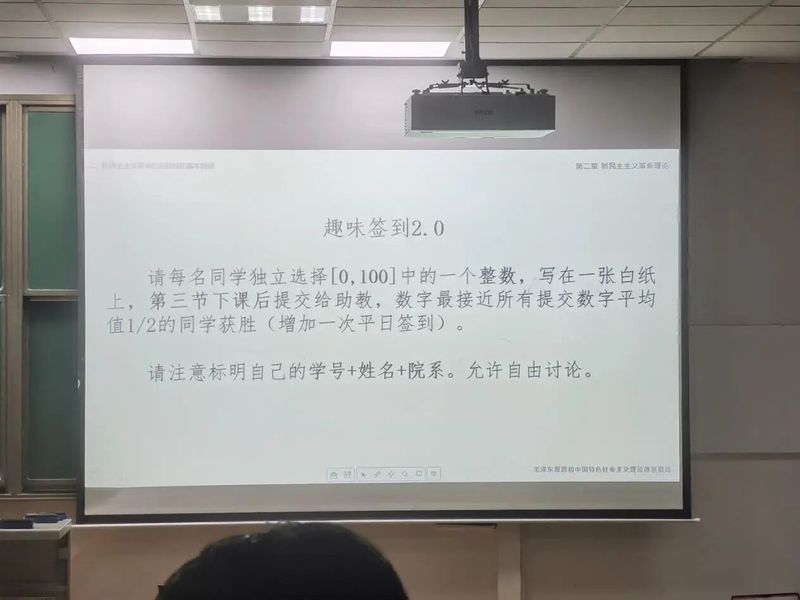 “请每名同学独立选择[0,100]中的一个整数,写在一张白纸第三节下课后提交给助教,数字最接近所有提交数字平均值1/2的同学获胜。”一番思索后,一位同学在纸条上,写下数字1。“就这个问题来讲,大概率有同学写的不是0,那么总数肯定是一个非0的数字,乘1/2肯定不是0,我就写了一个最接近0的1。”