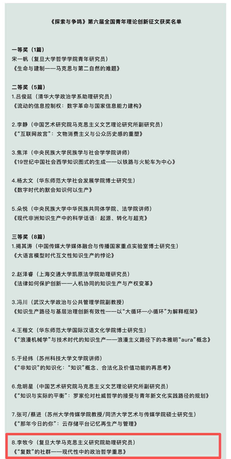 日前,第六届全国青年理论创新征文活动获奖名单公布,经过《探索与争鸣》编辑部初选、专家通讯评审、专家现场终评,共27位专家学者评审,最终评选出了一等奖1篇,二等奖5篇,三等奖8篇,提名奖10篇。我院青年教师李牧今所著论文《“复数”的社群——现代性中的政治哲学重思》荣获三等奖!