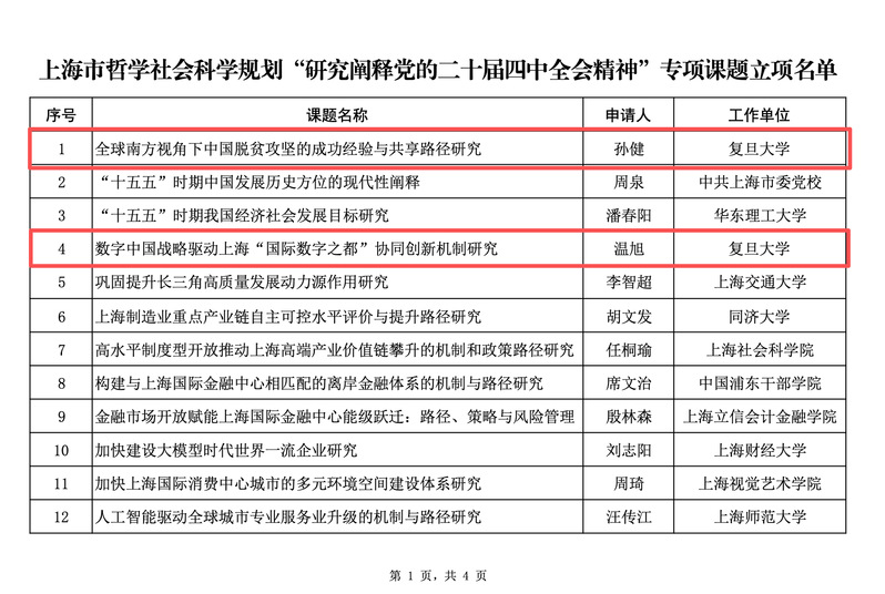 近日,上海市哲学社会科学规划办公室公示上海市哲学社会科学规划“研究阐释党的二十届四中全会精神”专项课题立项名单,我院教师孙健、温旭申报课题成功获批立项!